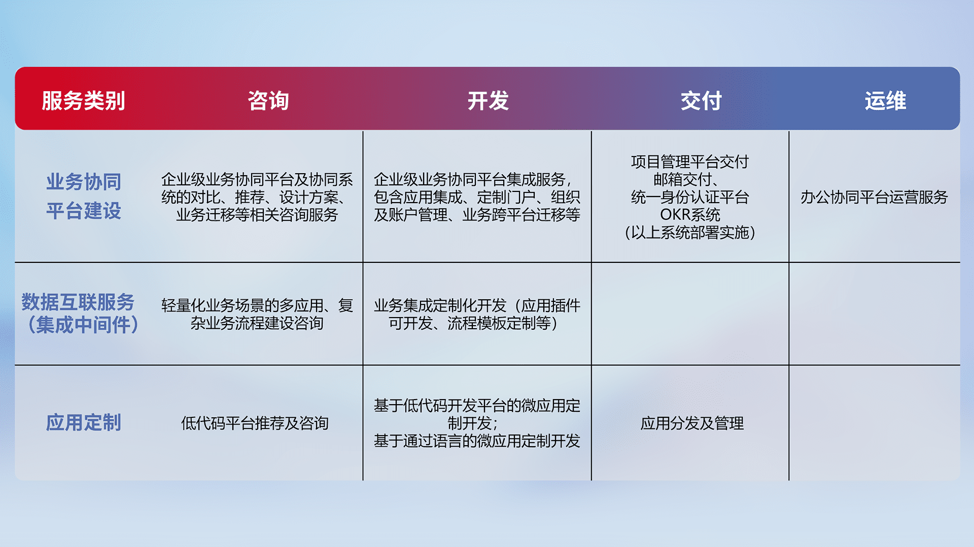 针对钉钉、、、、企微、、、IDaas等平台级产品提供产品的规划、、、、方案、、、交付、、、、定制化开发等服务,,实现如统一协同办公、、智能客户服务、、混合会议管理、、、智能数据查询、、、、等业务场景,,,实现数字化转型。。