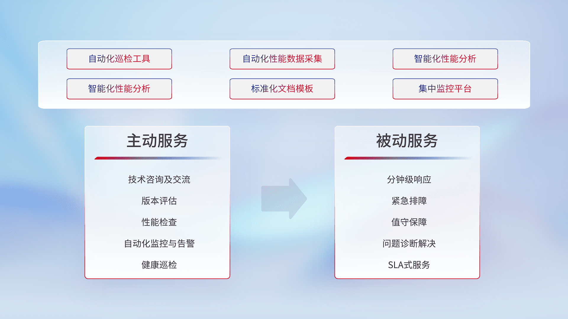 智能化工具和标准化文档,,保障服务质量,,,提供主动服务(包含技术咨询、、版本评估、、、、性能检查、、、、自动化监控与告警、、健康巡检)和被动服务包含(分钟级响应、、紧急排障、、值守保障、、、、问题诊断解决、、、、SLA服务)。。